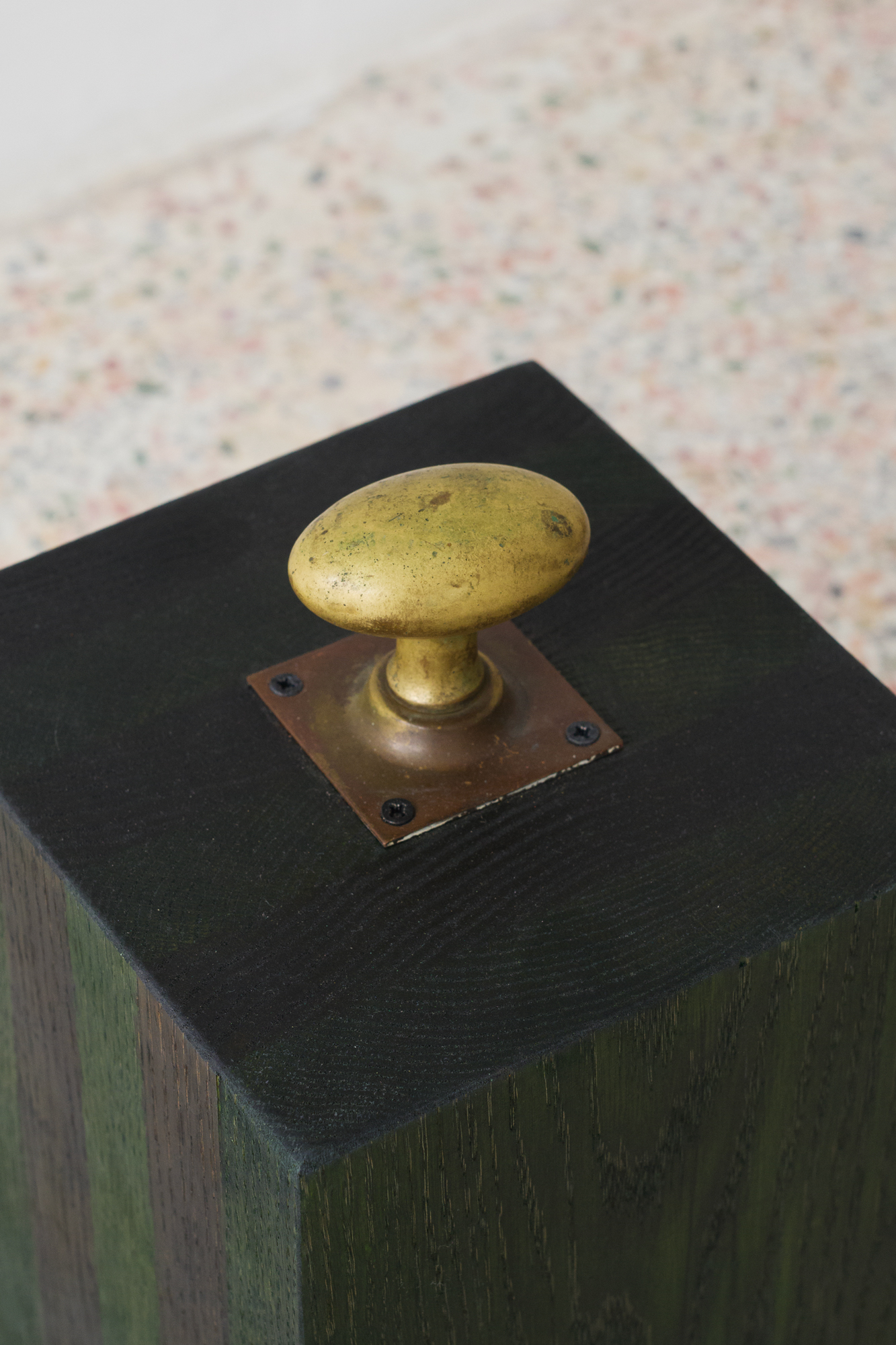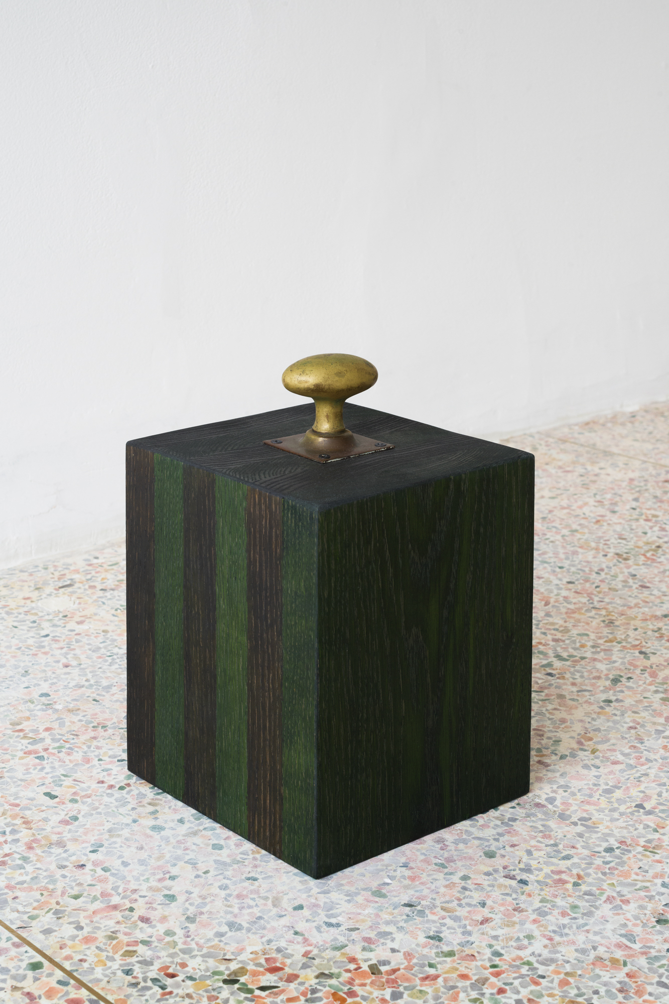 Doris Guo, Striped door, 2024. Red oak, wood glue, wood stain, sealant, hardware. 9 × 7 1/8 × 6 7/8 inches.
