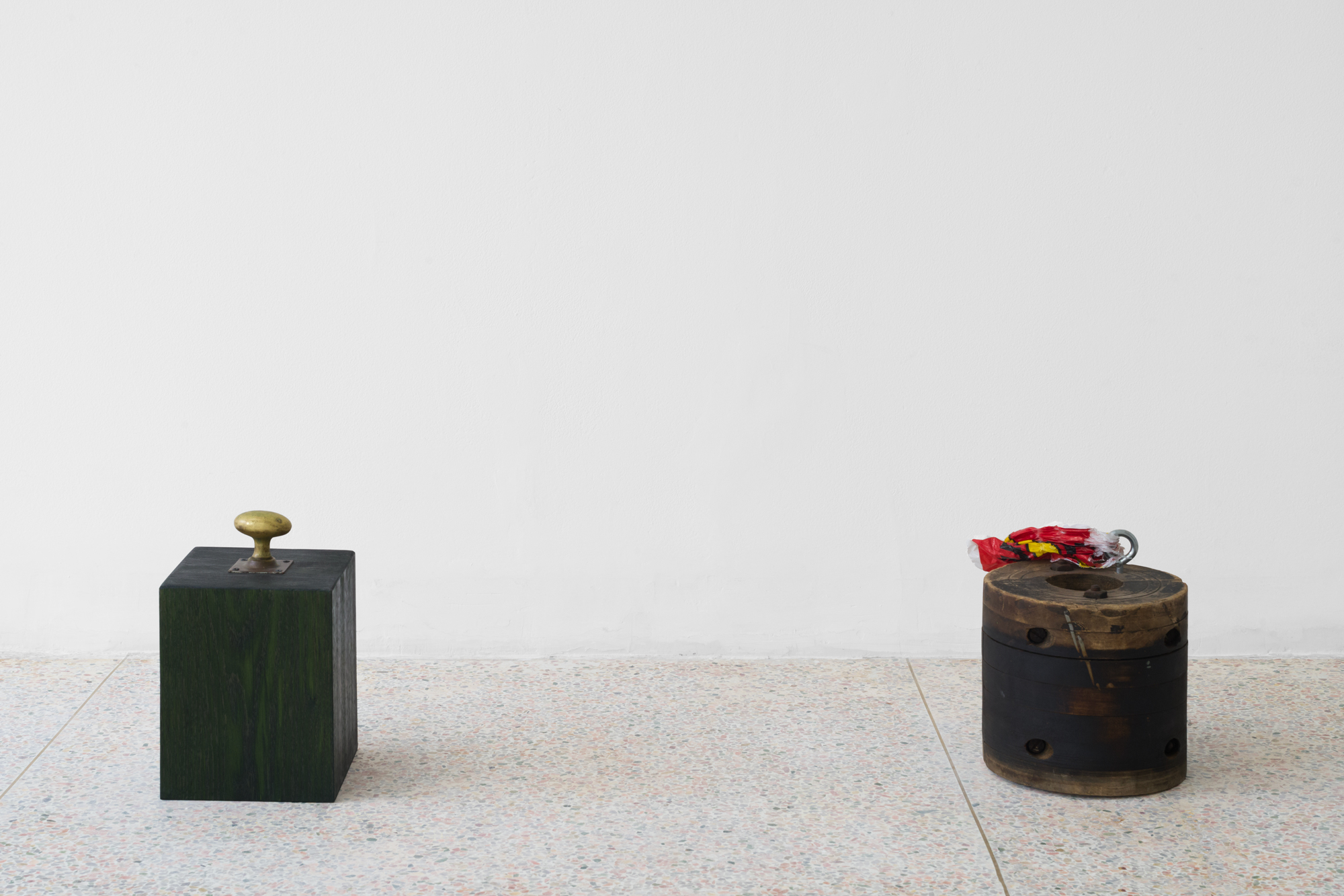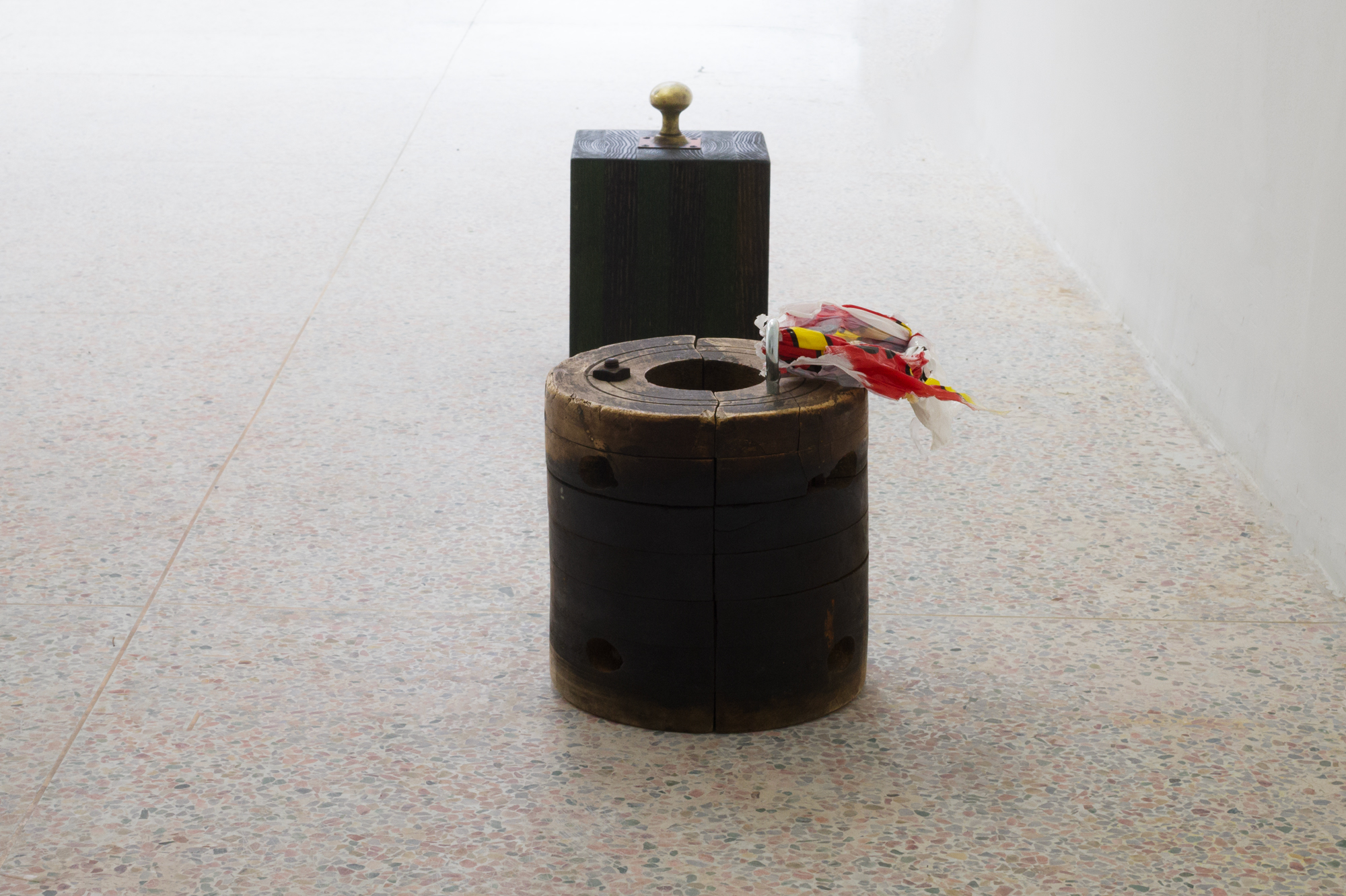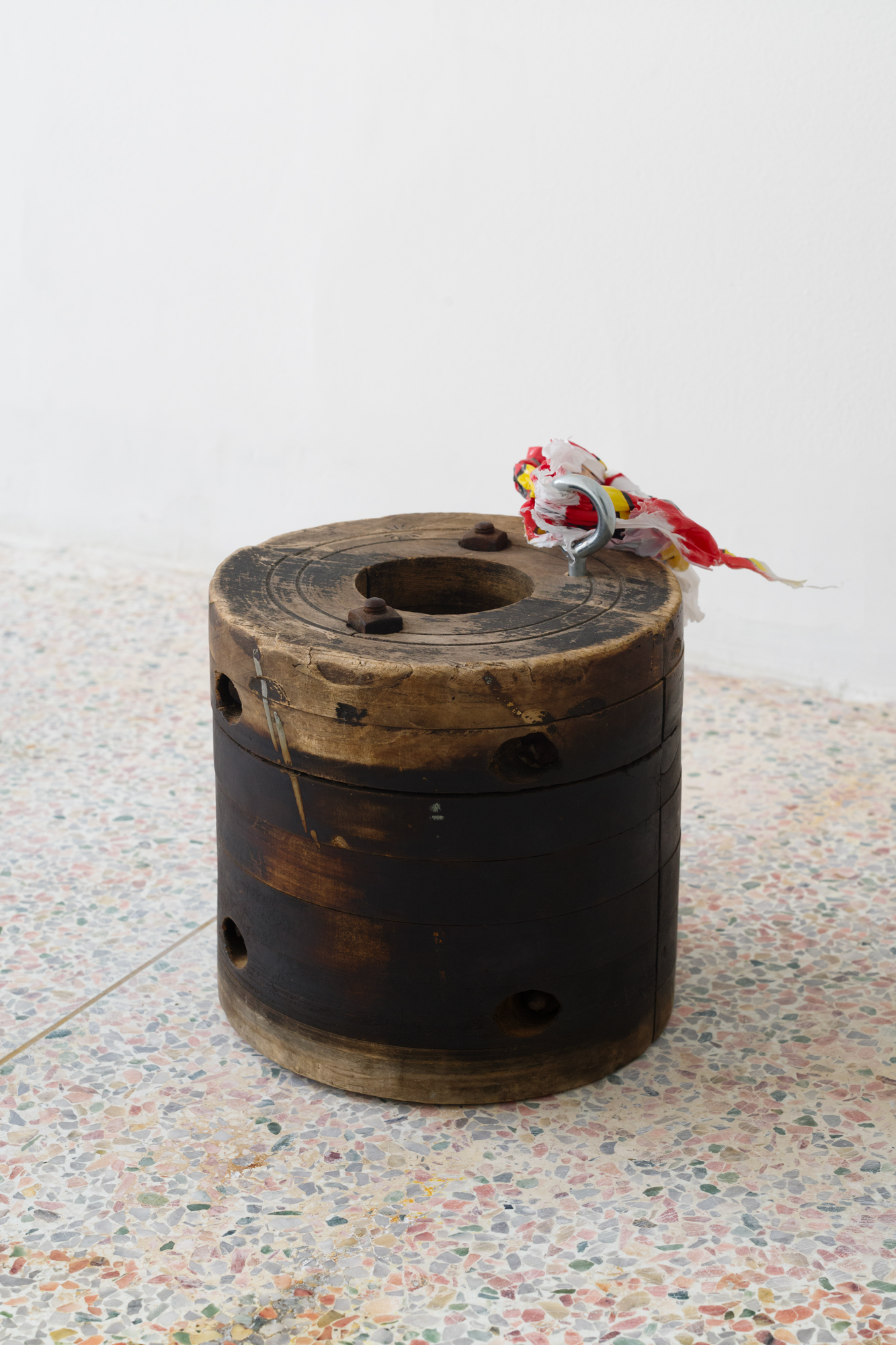Doris Guo, Wood pulley, 2024. Oak, hardware, plastic bag. 9 1/2 inches.